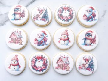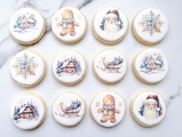 Cookies are flooded with royal icing. Images are then printed directly onto the cookie (with an edible printer). This option is great for those who want picture cookies (e.g., weddings, anniversaries, and birthdays) and corporate orders.
